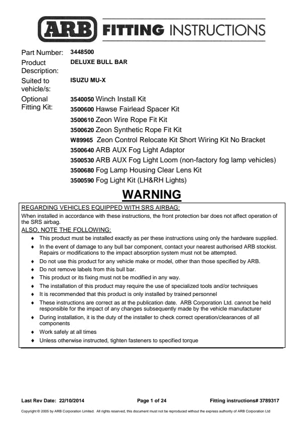 Vehicle specific fitting kit required to mount ARB Bumper to the vehicle chassis. This fitting kit has been specially designed to work with this vehicle's safety systems.