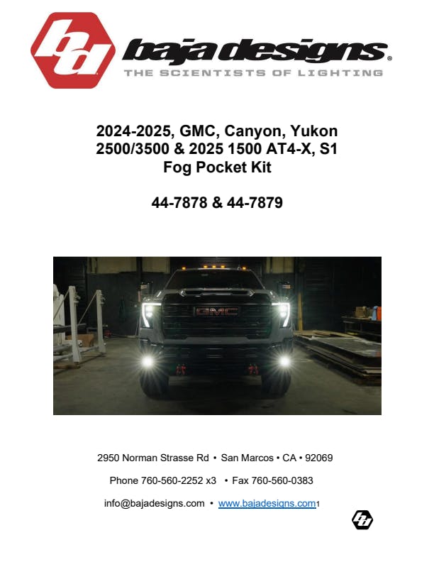 Upgrade your visibility and style with the Baja Designs S1 LED Fog Light Kit, engineered specifically for the 2024-2025 GMC Sierra 2500/3500 HD and 2025 1500 AT4-X trucks.. This premium fog light kit replaces your factory fog lights with powerful, compact Baja Designs S1 LED Lights that deliver 2,320 lumens each for exceptional performance in a sleek, factory-style fit. Built for serious off-road use, the S1 LED Light provides intense, crisp light to improve visibility in low-light conditions such as dust, rain or fog. The plug-and-play design ensures easy installation using factory mounting locations and wiring, so no cutting or splicing is required. Designed for adventurers, off-road enthusiasts, and those seeking top-tier lighting solutions, the Baja Designs S1 fog pocket LED Light kit is the epitome of durability and performance in a compact package. With our 30-day satisfaction guarantee and limited lifetime warranty for the ultimate in purchase protection, illuminate your path with confidence and experience unparalleled visibility wherever your adventures in your GMC takes you.