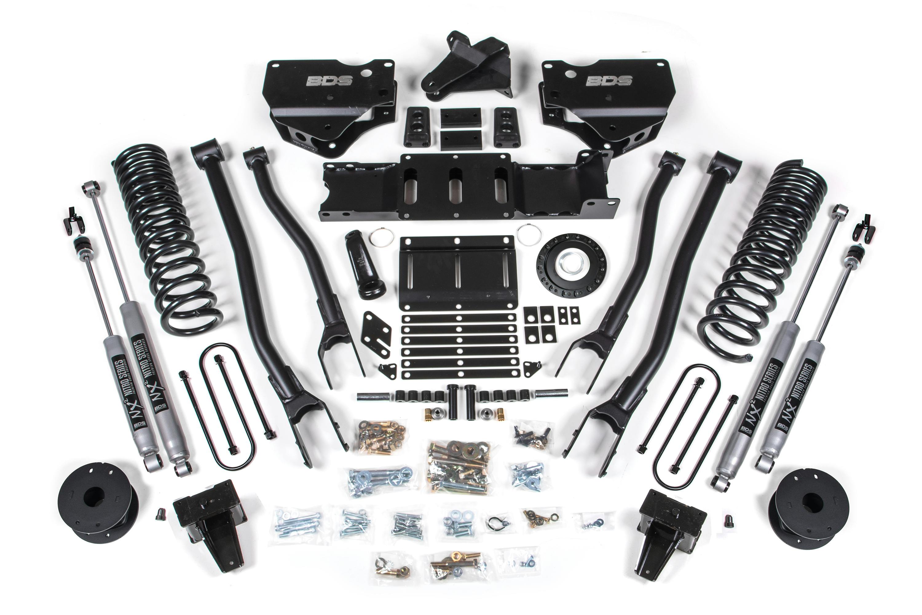 Up the ante of your RAM 3500 diesel truck equipped with factory rear air ride to the next level with this 6-inch 4-Link lift kit from BDS. Designed to improve stance, performance, and capability, this kit includes everything necessary to set your truck up right with clearance for up to 37" tires.
