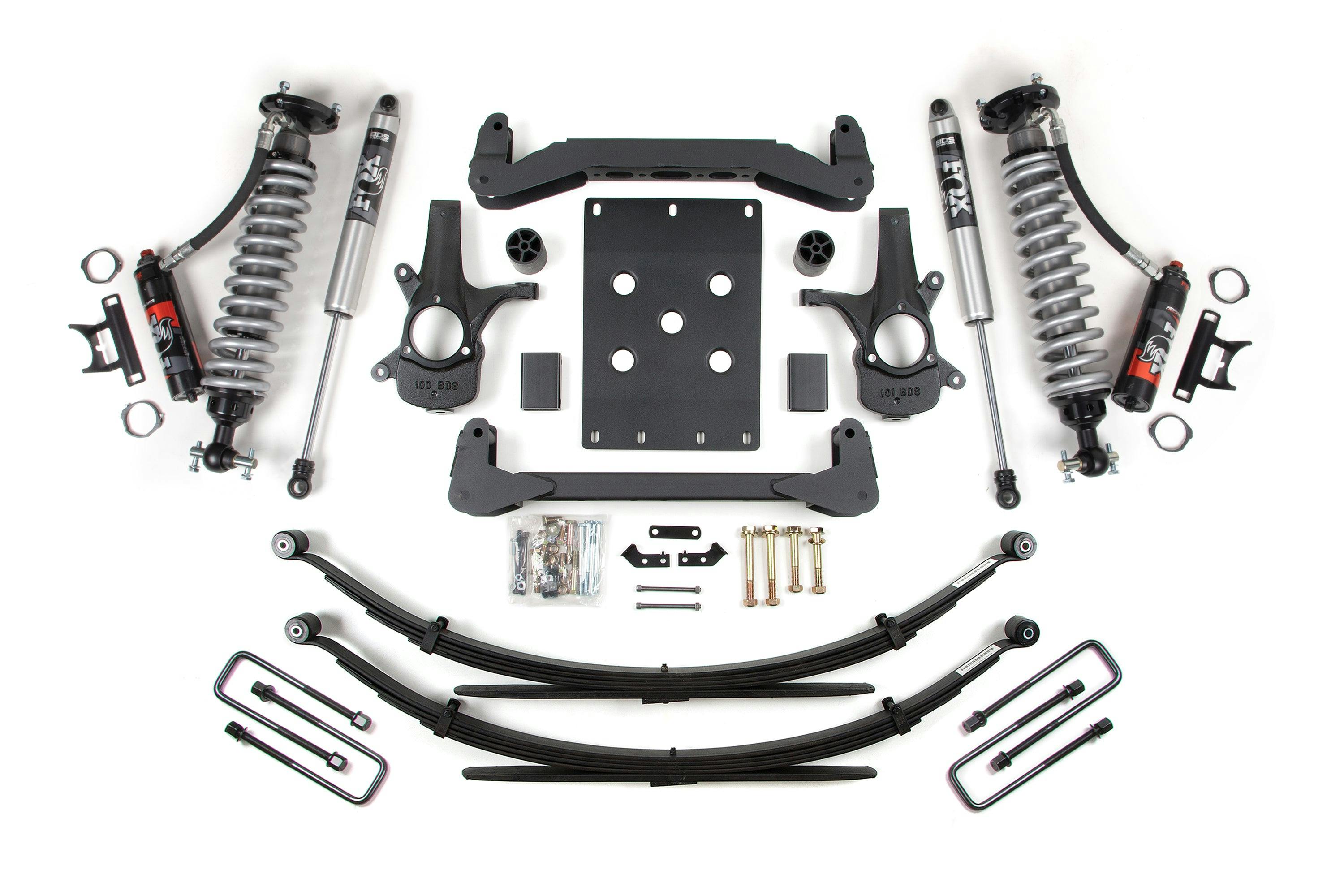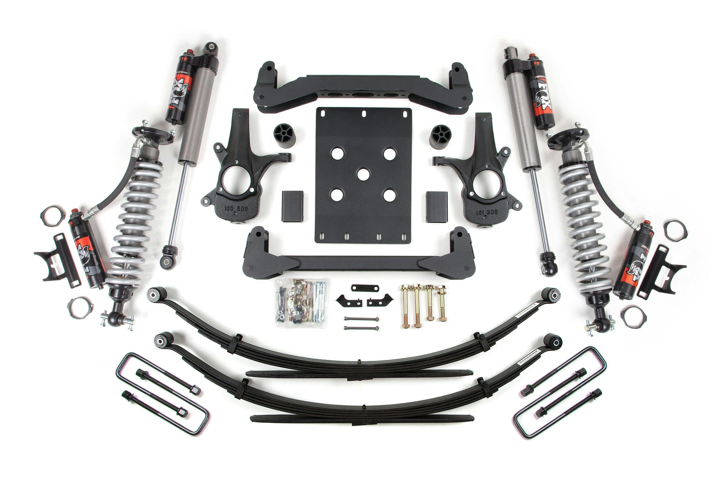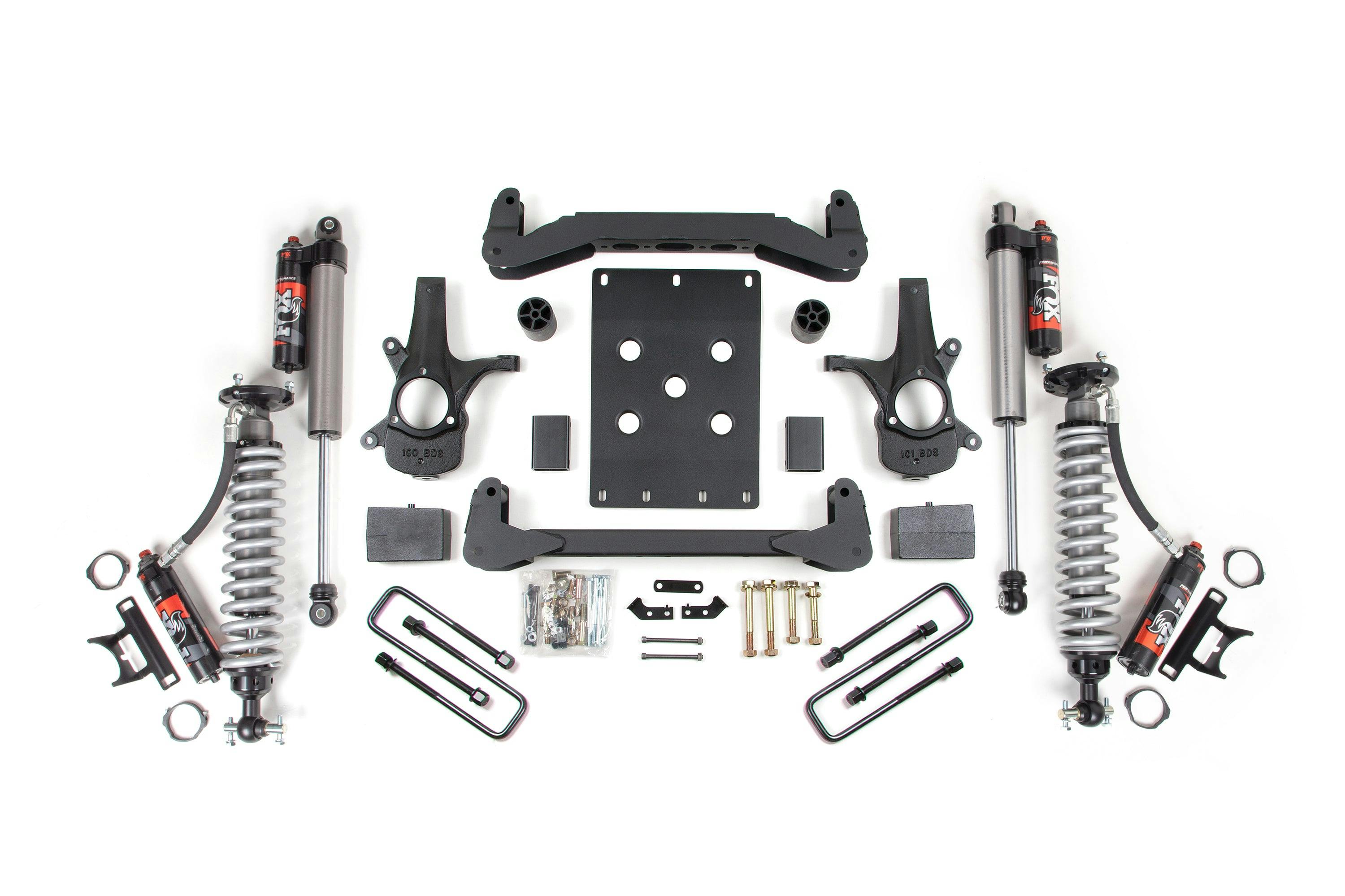 BDS corrects steering geometry at the new, taller ride height using a pair of high-strength, CNC-machined ductile cast-iron steering knuckle designs that work with factory tie rod ends to maintain steering angles for proper function and ESC compatibility.- Fox 2.5 Shocks designed specifically for increased travel and the abilty to soak up the roughest terrain.