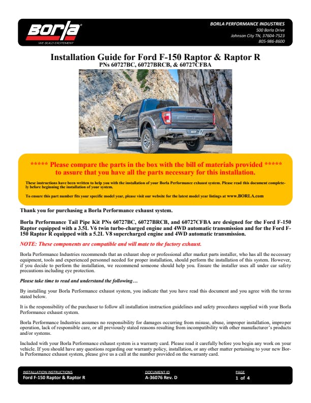 - Use with Borla(r) Mid-Sections / Muffler Assemblies 60728, 60736, or 60737, or O.E. Mid-Section