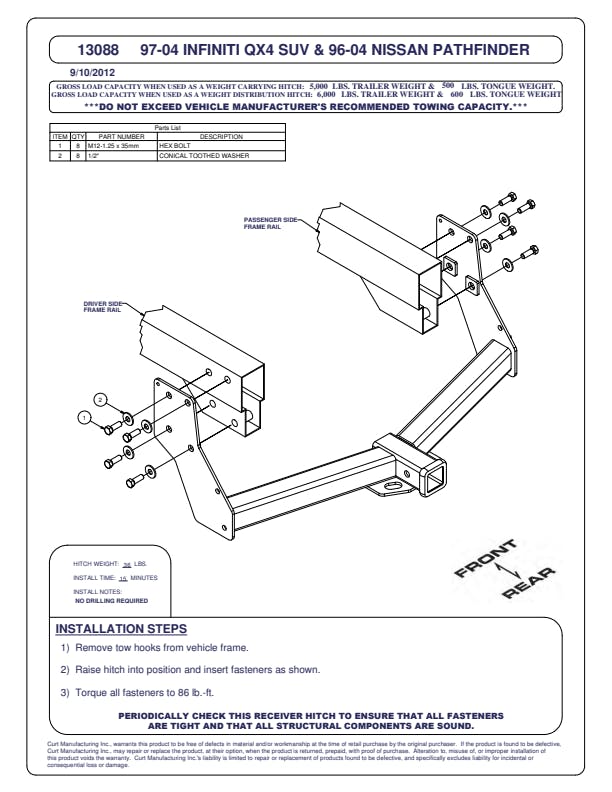 Whatever your task at hand -- whether it's launching that boat before daybreak, setting up your camper before the rush or getting a final load to the dump before close -- CURT class 3 trailer hitches offer the strength needed for serious towing. They make it easy to hitch up and Bring It, offering a vehicle-specific fit and the weight capacity to handle a variety of trailers. Custom class 3 hitches are the most common type of receiver hitch for pickup trucks and SUVs. Because of their weight range, they are also found on full-size cars, crossovers and minivans. Each custom-fit class 3 hitch package is made for vehicle-specific mounting. This particular kit fits certain years of the Nissan Pathfinder and Infiniti QX4 (see application info to verify vehicle compatibility). It provides a weight carrying capacity of 5,000 lbs. GTW and 500 lbs. TW. It is also compatible with a weight distribution hitch for level towing and a rating of 6,000 lbs. WD and 600 lbs. WDTW. CURT class 3 trailer hitches are typically used to attach and haul utility trailers, boat trailers, campers, snowmobile or ATV haulers and more (NOTE: Never exceed the lowest-rated towing component). Each class 3 hitch has a 2" receiver tube and is tested in accordance with SAE J684 for safety. To ensure that CURT class 3 receiver hitches have what it takes for serious trailering, they are designed using a hands-on approach and are constructed with rugged, high-strength steel and precise welding. We also protect our class 3 hitches in a co-cured finish of liquid A-coat and black powder coat for superior resistance to rust, chipping and UV damage.