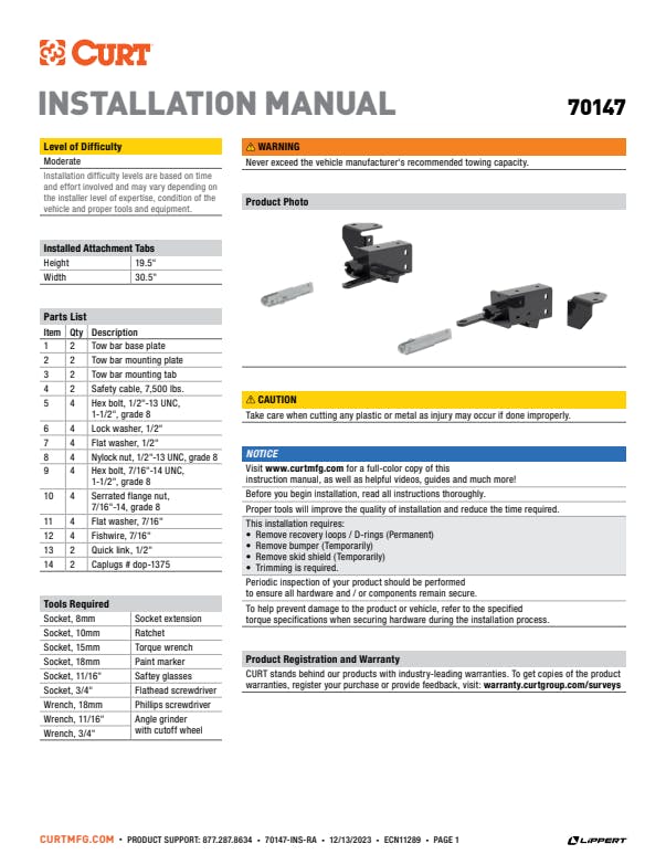 - Includes base plate, safety cables and installation hardware (tow bar sold separately)