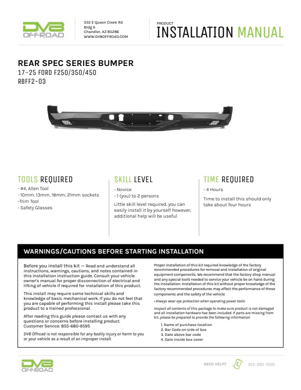 DV8 Offroad’s Super Duty Spec Series Rear Bumper delivers full-width rear protection for F250, F350, and F450 models. It supports two 3" pod lights, retains factory sensors, license plate lights, and works with the OEM hitch. Features welded zip-tie tabs for clean wiring and satin Spec Series mesh inserts. Finished in micro-texture black powder coat. Bolt-on installation with very minor trimming required. Not compatible with drop-down side steps.