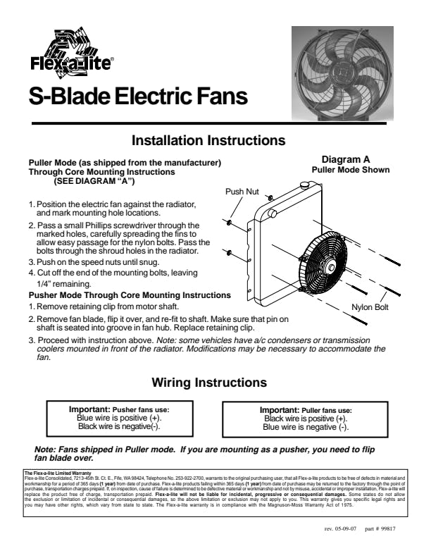 Slim Design; Fully Reversible; S-Blade; Quiet Operation; Efficient Air Movement; Frees Up Horsepower; Provides Additional Cooling; Installation Instructions| Attributes | |