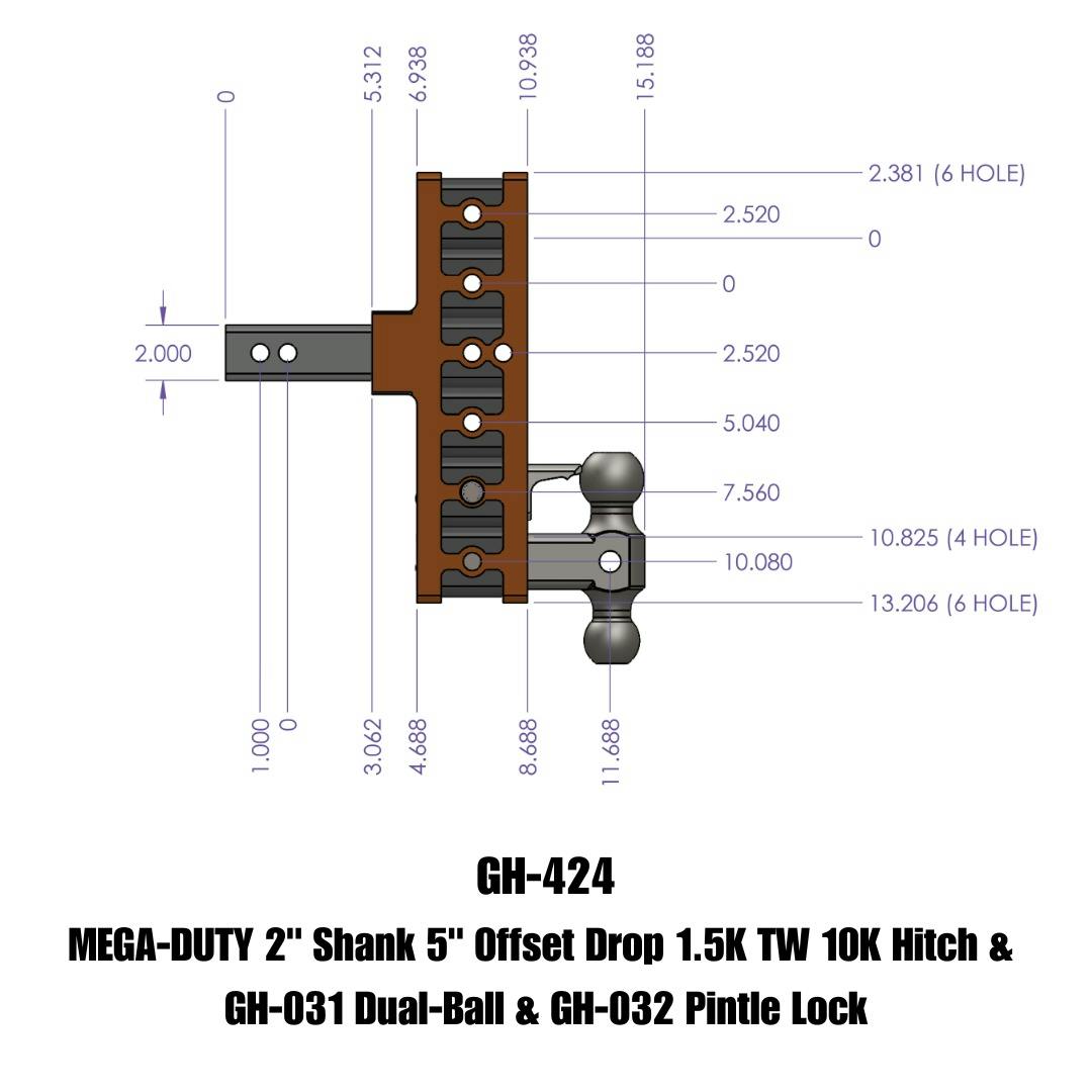 MEGA-DUTY 2" Offset Shank 2.5 Rise, 5" Drop 1.5K TW 10K Hitch & GH-031 Dual-Ball & GH-032 Pintle Lock