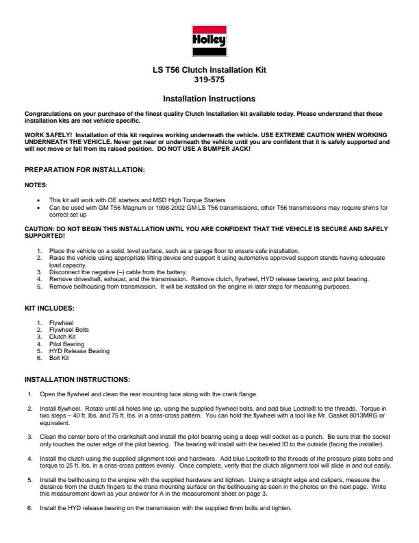 This Kit includes all the hardware and components needed for a complete clutch install on a 6-bolt crank LS engine using a T-56 transmission. A 12-inch organic disc with a 6 spring helix sprung hub provides the superior grip needed for the strip, while the matched diaphragm style pressure plate provides a pedal feel comfortable enough for the street. This provides 30% more clamping pressure and transmits that through a Billet steel flywheel.