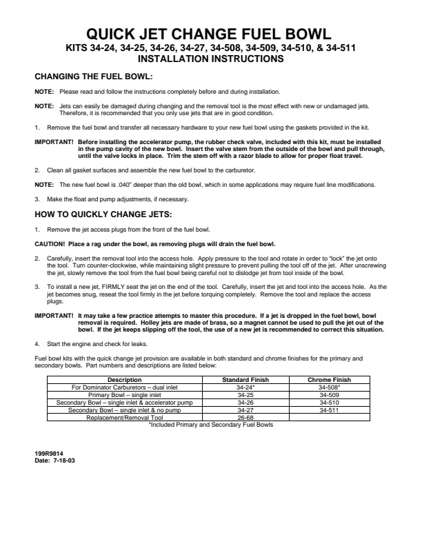Quick Change Jet Kits For Model 4500 Dominator Standard includes primary bowl, secondary bowl and P/N 26-68 jet tool