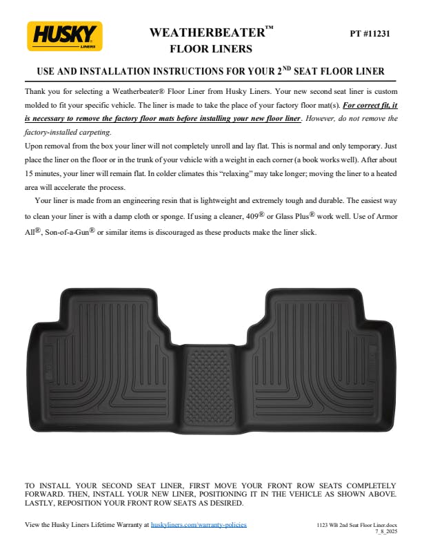 - WeatherBeater(TM) Liners offer protection that extends all the way to your rear seats. So go ahead, lift the seats and leave them up, load after load. Husky's got your floors, and your back, no matter what the road brings your way.