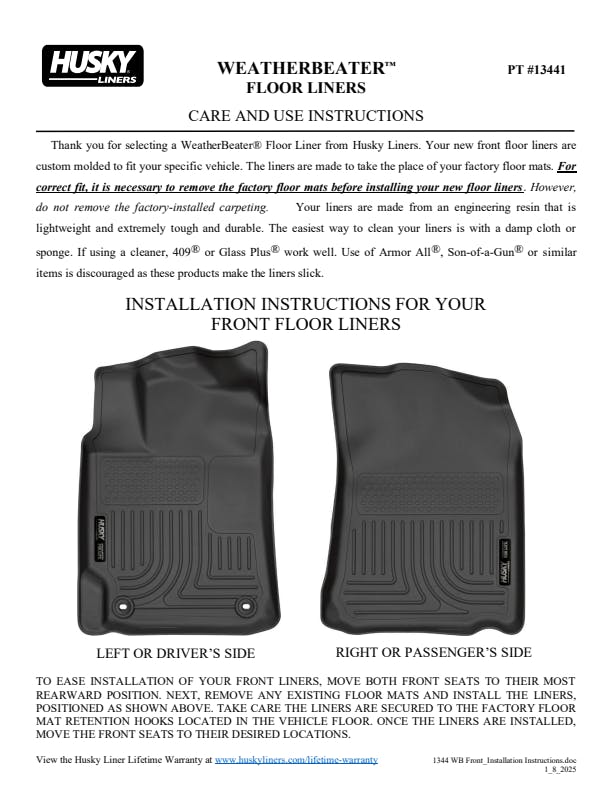 Expand the Husky Liner protection you love from bumper to bumper, with Weatherbeater? Cargo Liners. These all-weather, any-conditions liners are ready for anything you throw in the back and stand up to even the toughest spills. Husky?s rubberized DuraGrip? surface and ProGard? formula keep cargo protected with durable flexibility, and no shifting around. Installs in minutes and stays in place until you?re ready to take out and clean. Available in black, gray, or tan for a factory look to match your vehicle?s interior. Backed by Husky Liners Guaranteed for Life. Proudly made in the U.S.A.