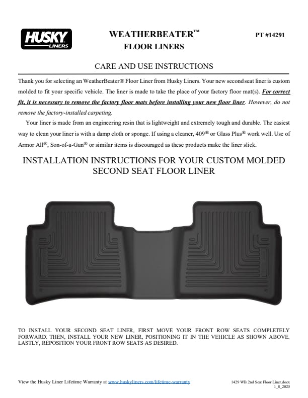 - WeatherBeater(TM) Liners offer protection that extends all the way to your rear seats. So go ahead, lift the seats and leave them up, load after load. Husky's got your floors, and your back, no matter what the road brings your way.