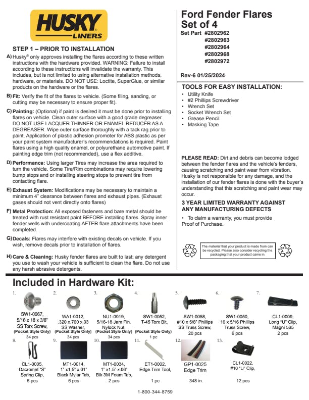 - OE Style fender flares are covered by Husky Liners Limited Lifetime Warranty. Featuring Husky's legendary durability, so they're built to last. Proudly made in the USA with global materials.