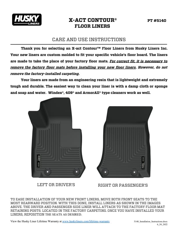 Nothing fits your vehicle better or protects longer than Husky X-act Contour?. These liners combine laser-scanned, exact fit with a no-slip, DuraGrip? surface and a softer feel. Plus, the rock-solid stability delivered by your vehicle?s factory retention posts, and our StayPut? Nibs for a no-slip, no-slide, surface with absolutely zero compromise in protection. They?re built to stand up to whatever you?re laying down? including chemicals like battery acid and oil, with our FormFit Edge? to keep whatever spills contained for easy cleanup. Available in black. Built for a lifetime of rugged abuse, warrantees the same.