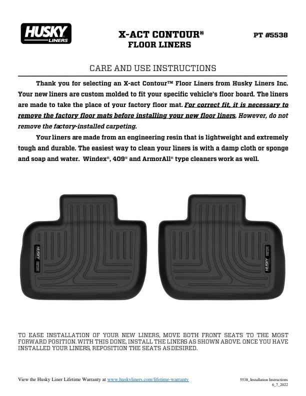 Nothing fits your vehicle better or protects longer than Husky X-act Contour?. These liners combine laser-scanned, exact fit with a no-slip, DuraGrip? surface and a softer feel. Plus, the rock-solid stability delivered by your vehicle?s factory retention posts, and our StayPut? Nibs for a no-slip, no-slide, surface with absolutely zero compromise in protection. They?re built to stand up to whatever you?re laying down? including chemicals like battery acid and oil, with our FormFit Edge? to keep whatever spills contained for easy cleanup. Available in black. Built for a lifetime of rugged abuse, warrantees the same.