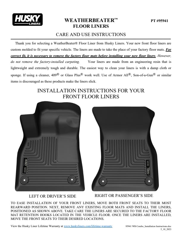 The original all-weather liner is ready, come hell or hot coffee. The Weatherbeater?s construction is a no-slip zone with zero edge curl, and its Stay Put Nibs keep it firmly anchored underfoot. It stands up to chemicals like gas, oil and battery acid, and stays tough and flexible, even under extreme temperatures. Its laser-scanned, FormFit Design? gives your truck, van or SUV an ultra-clean look with easy cleanup to match, while its patented, FormFit Edge? keeps spills contained, carpets unstained. It?s unbeatable Husky protection for life, warrantied the same. Proudly made in the USA.