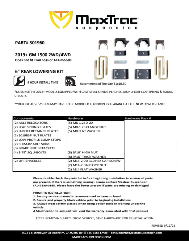 MAX TRAC SUSPENSION'S PART# 201960 IS A 6" REAR LOWERING BOX KIT INCLUDING FLIP KIT, SHACKLES, BUMP STOPS & SHOCKS