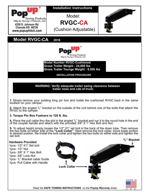 The RVGC-CA (Cushion Adjustable) is a product that will allow you to pull your 5th wheel camper with a Gooseneck ball without having to bolt on an adapter. This is a one piece product that bolts into your existing bolt holes where your king pin box is mounted currently. Simply unbolt your existing king pin box and install the RVGC in the same bolt holes. This product is rated at 24,000 lbs and a tongue weight rating of 6,500 lbs. A smooth ride for you and your cargo without bulky air bags. A single high-tech cushion does the job. The RVGC-CA is the cushion adjustable model which gives you 4 of adjustment down by the coupler and most trailer manufacturers have adjustable whole patterns to allow you an extra 3 of adjustment where it bolts to your 5th wheel. Which makes the total about 7 of adjustment. Bolt hole location and number of holes will vary depending on the configuration of your current pin box model. Picture shown may not be the exact model for your application. The number of holes, and size of holes are specific to the pin box model currently on your unit.