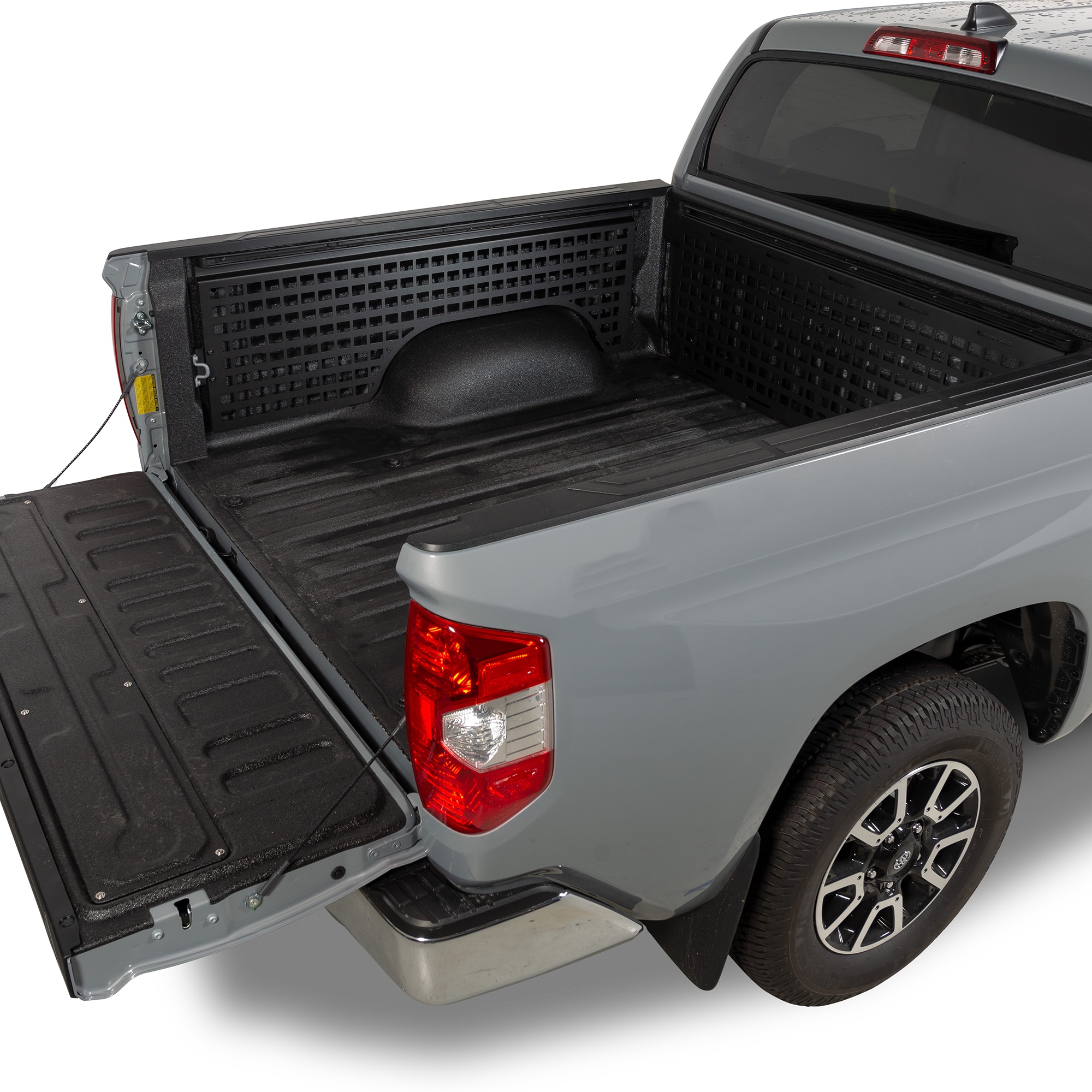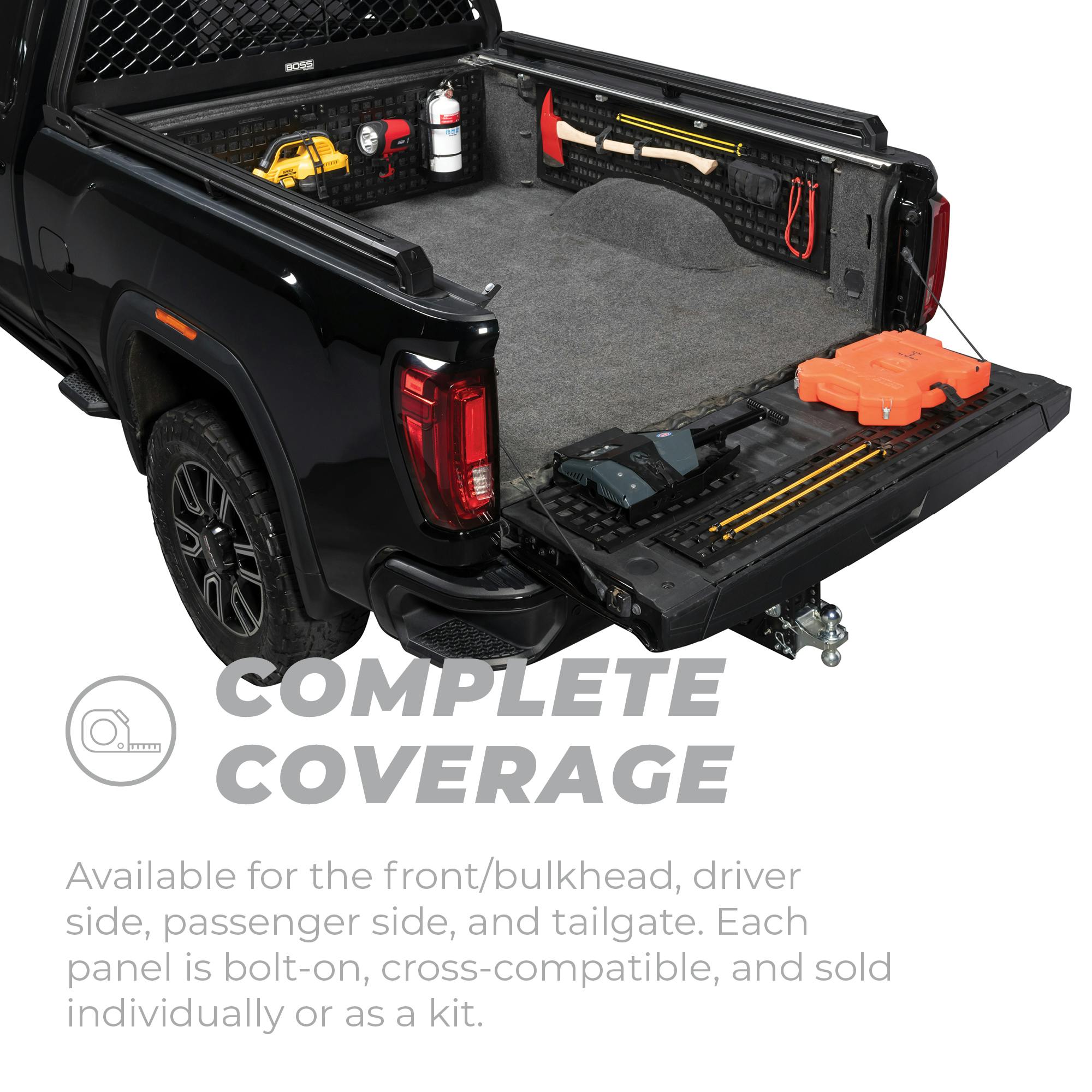 Secure your cargo in the back of your truck bed with this next level one of a kind truck bed storage organizing system. New from Putco are the Molle Panel inside truck bed panels system. This amazing cargo storage system is perfect for latching down nearly anything you want to secure in place like Molle bag, trail gear, construction gear, jacks, or anything your heart desires. Available for the bulkhead, side bed and tailgate area. Choose from getting the entire set or just getting one side. Great for Overlanding pickup trucks or work trucks to hang and organize gear, tools and more. These truck bedside organizers called molle panels are great for storing your gear and organizing your truck bed whether you use your pickup for work or play. Plus the are a must-have for the overland truck for your next outdoor adventure.Constructed out of durable CNC cut 10 gauge aluminum that is finished with a mini-textured black powder-coat. This American made panel system works with most industry-leading mounting accessories like Quickfist, Kolpin, Molle, and much more. Also, this come is compatible with most soft roll-up and hard fold cover on the market.Installing a Molle panel is simple with no drilling or cutting of any kind and its custom design for your year, make and model allows you to use your OEM tie-down area and other standard OEM features of your truck. Each panel is backed by a three-year warranty. So if you are tired of your cargo rolling around and want it secured in place the Putco Molle Panels are for you.