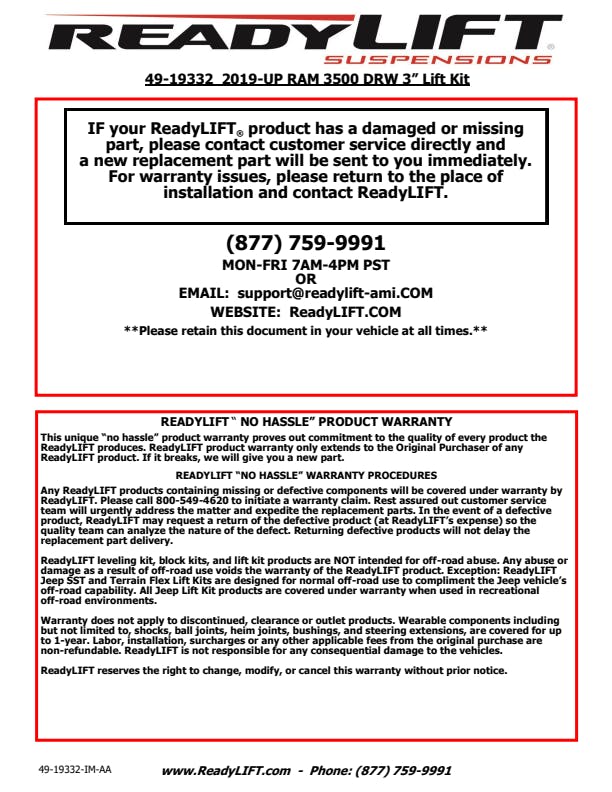 Lift and level out your RAM 3500 dually diesel-powered truck with ReadyLIFT '' new 3-inch lift kit. ReadyLIFT's kit provides plenty of clearance for larger aggressive tires and wheels delivering a muscular, tough look, all while improving the factory ride quality while clearing up to 35x12.50 tires. The new Ram HD 3" Coil Spring Lift Kit is specifically designed for Heavy-Duty applications utilizing ReadyLIFT-engineered new front coil springs and Falcon 1.1 Monotube front & rear shocks. The 3500 dually kit includes rear blocks and U-bolts to achieve a neutral, lifted stance. Ram 3500 dually trucks equipped with rear air require the new air spacer part number www.readylift.com/2019-2023-ram-3500-dually-rear-air-3-spacer-kit.html 26-19332 . Features and Benefits: Front Coil Spring 3" Lift Suspension. Max Lift 3 in - Max Tire Diameter 35 in. For 2019-2023 Ram 3500 Dually. 4-Corner Falcon 1.1 Monotube Shocks. Diesel Motor Ram 3500 Dually HD's only. Wheel Fitment 20x8.5 -145/+145 Offset. Note: Trucks equipped with rear air require additional spacers PN: www.readylift.com/2019-2023-ram-3500-dually-rear-air-3-spacer-kit.html 26-19332 . Not compatible with Power Wagon, single cab trucks, or Snow Prep/Ambulance Package. 37 '' tires will require trimming.