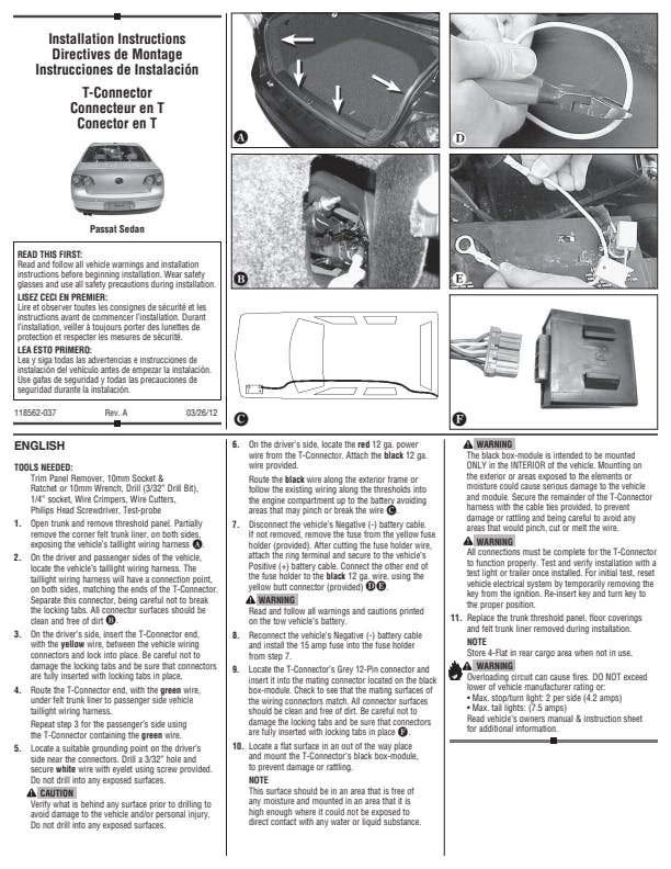 T-One Connectors require no splicing of vehicle wires. Simply locate your vehicles wiring harness connector, unplug the connection and insert the T-One Connector into the vehicle's harness. No special tools required. Factory appearanceQuick and easy installationSolid, weatherproof, one-piece constructionNo cutting, splicing or taping of vehicle wiresIncludes converter where needed16 gauge bonded wire with 4-Flat plug & capStop/Turn circuit capacity of 4.2 AmpsTaillight circuit capacity of 7.5 Amps1 year limited warrantyStop/Turn circuit capacity of 4.2 Amps