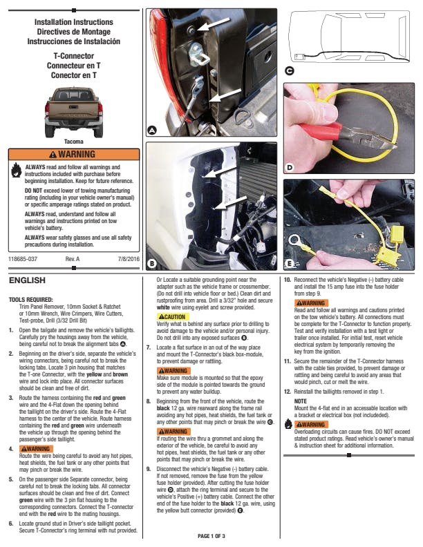 T-One Connectors require no splicing of vehicle wires. Simply locate your vehicles wiring harness connector, unplug the connection and insert the T-One Connector into the vehicle's harness. No special tools required. Factory appearanceQuick and easy installationSolid, weatherproof, one-piece constructionNo cutting, splicing or taping of vehicle wiresIncludes converter where needed16 gauge bonded wire with 4-Flat plug & capStop/Turn circuit capacity of 4.2 AmpsTaillight circuit capacity of 7.5 Amps1 year limited warrantyStop/Turn circuit capacity of 5 Amps